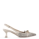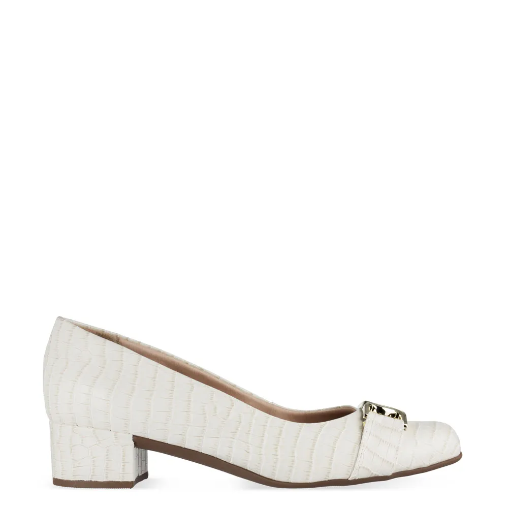 Scarpin com bico redondo com textura e fivela frontal ouro Verniz off-white Salto 4 cm Forro em tecido macio
